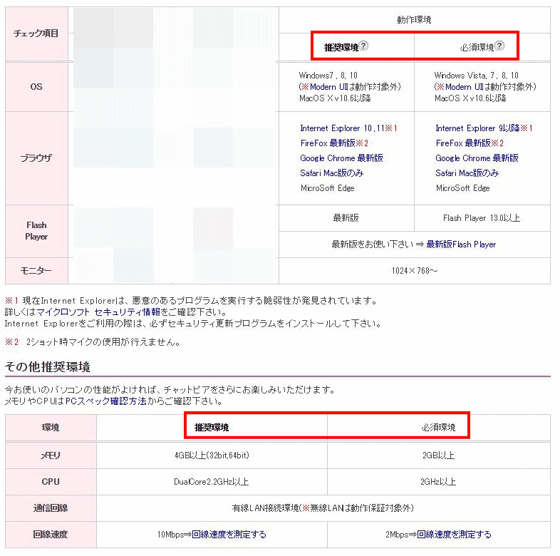 チャットピアを利用するに必要な推奨しているシステム動作環境